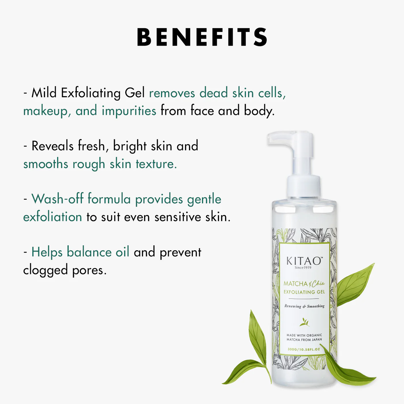 Kitao Matcha & Chia exfoliating gel not only removes dead skin cells, or trapped impurities on your skin, but it also leaves your pores smaller, your face more hydrated, and your skin brighter. Sound too good to be true? We promise it’s not! This formula contains all the superfoods your skin craves (matcha, quinoa, chia seed & açai), but also includes ultra nutrient-dense ingredients like artichoke leaf extract and camellia sinensis leaf powder. No matter what the day throws at your skin, we guarantee this exfoliating gel will be able to remove it (even the dirt that gets trapped deep in pores!). If you’ve tried exfoliants before that were too harsh and left your skin feeling dry and irritated, then this is the perfect gentle solution. And, because our formula is so gentle, it’s safe to use on all skin types.